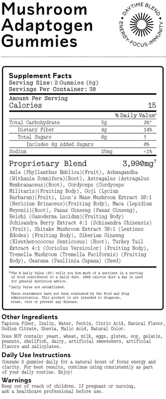 Our vegan and sugar-free Daytime Blend Mushroom Adaptogen Gummies are formulated with the goal to naturally boost energy, focus, and immunity.