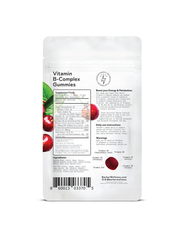 Our vegan, sugar-free Vitamin B Complex Gummies deliver a powerful blend of essential B vitamins to support natural energy, metabolic health, and overall vitality. Each cherry-flavored gummy features a potent dose of Vitamin B12, alongside B1, B6, B5, B7, and B9—working together to promote energy production, nervous system function, and a balanced metabolism.