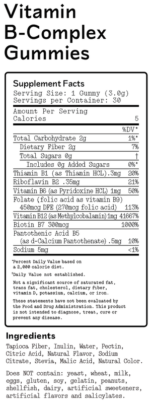 Thiamin B1 (as Thiamin HCL), Riboflavin B2, Vitamin B6 (as Pyridoxine HCL), Folate (folic acid as vitamin B9), Vitamin B12 (as Methylcobalamin), Biotin B7, Pantothenic Acid B5 (as d-Calcium Pantothenate), Tapioca Fiber, Chicory Root Inulin, Water, Pectin, Natural Flavors, Citric Acid, Sodium Citrate, Stevia, Malic Acid, Natural Color
