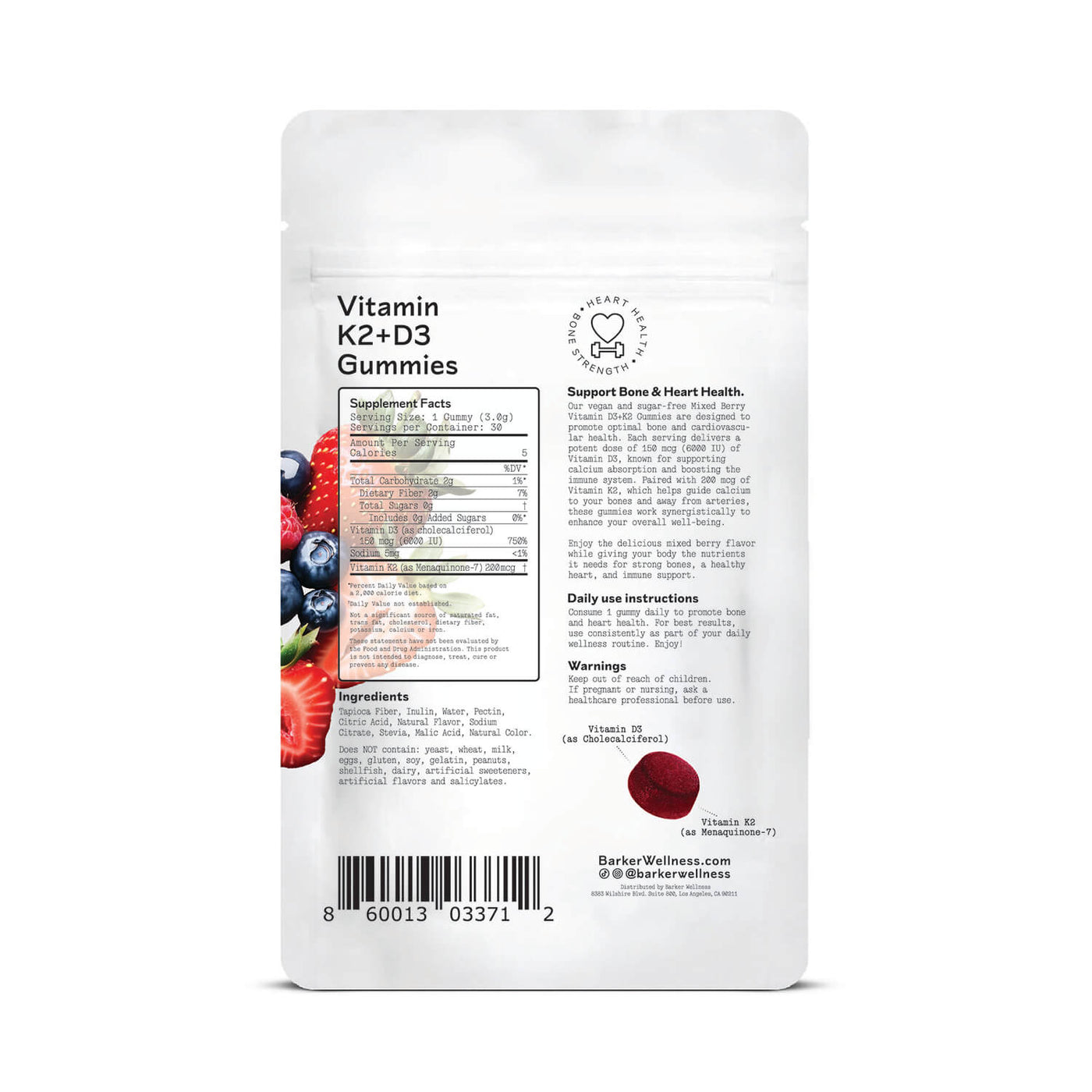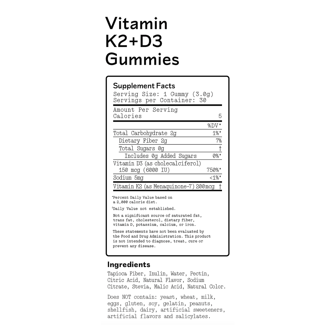 Vitamin D3 (as cholecalciferol), Vitamin K2 (as Menaquinone-7), Tapioca Fiber, Chicory Root Inulin, Water, Pectin, Natural Flavors, Citric Acid, Sodium Citrate, Stevia,Malic Acid, Natural Color